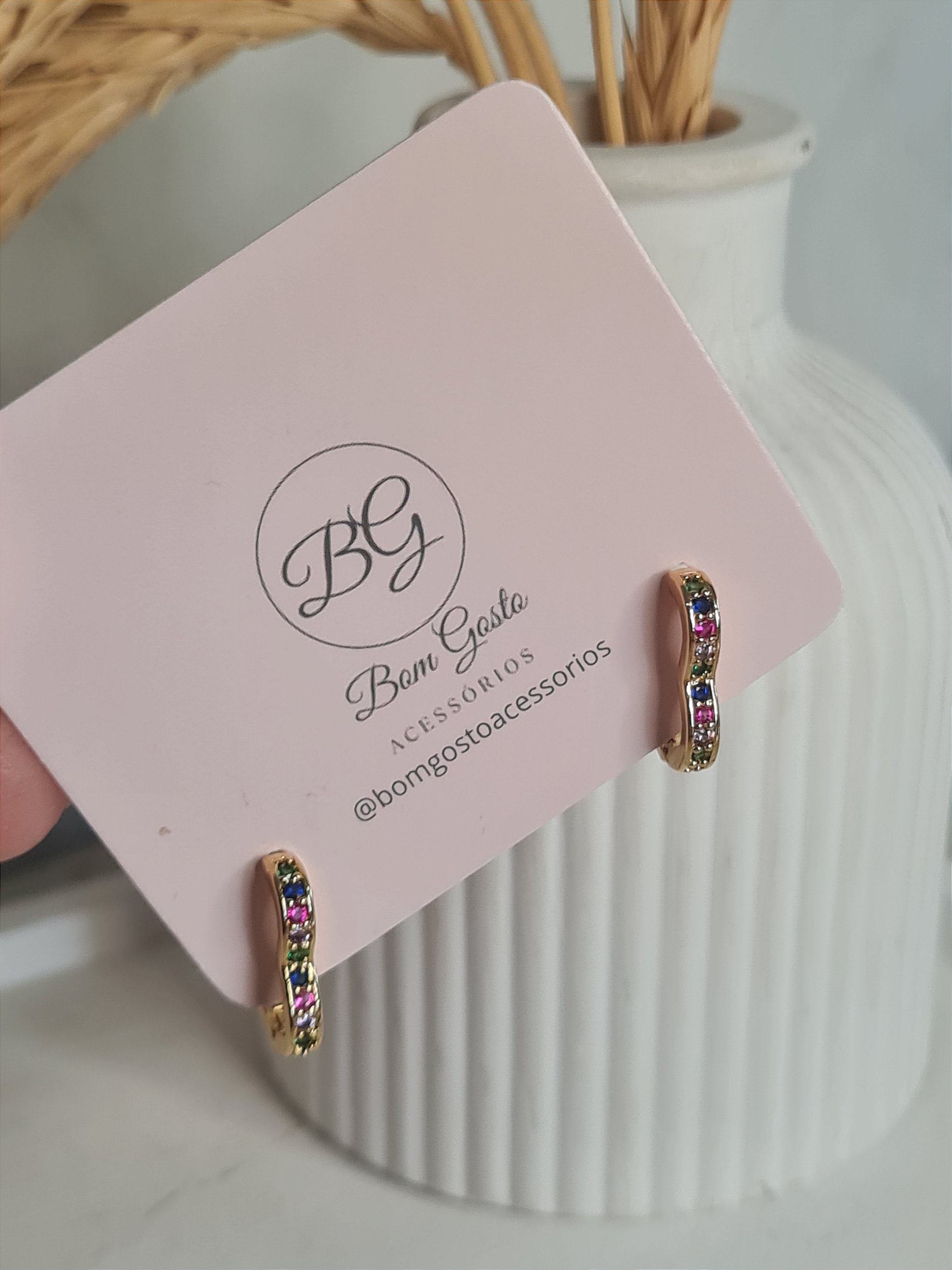 Argola de coração pequena cravejada colorida com banho dourado. Leve, delicada e perfeita para uso diário ou para compor mix elegante.