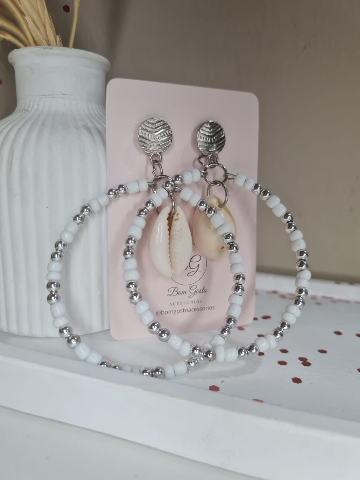 Argola de miçanga branca com prateada e buzios