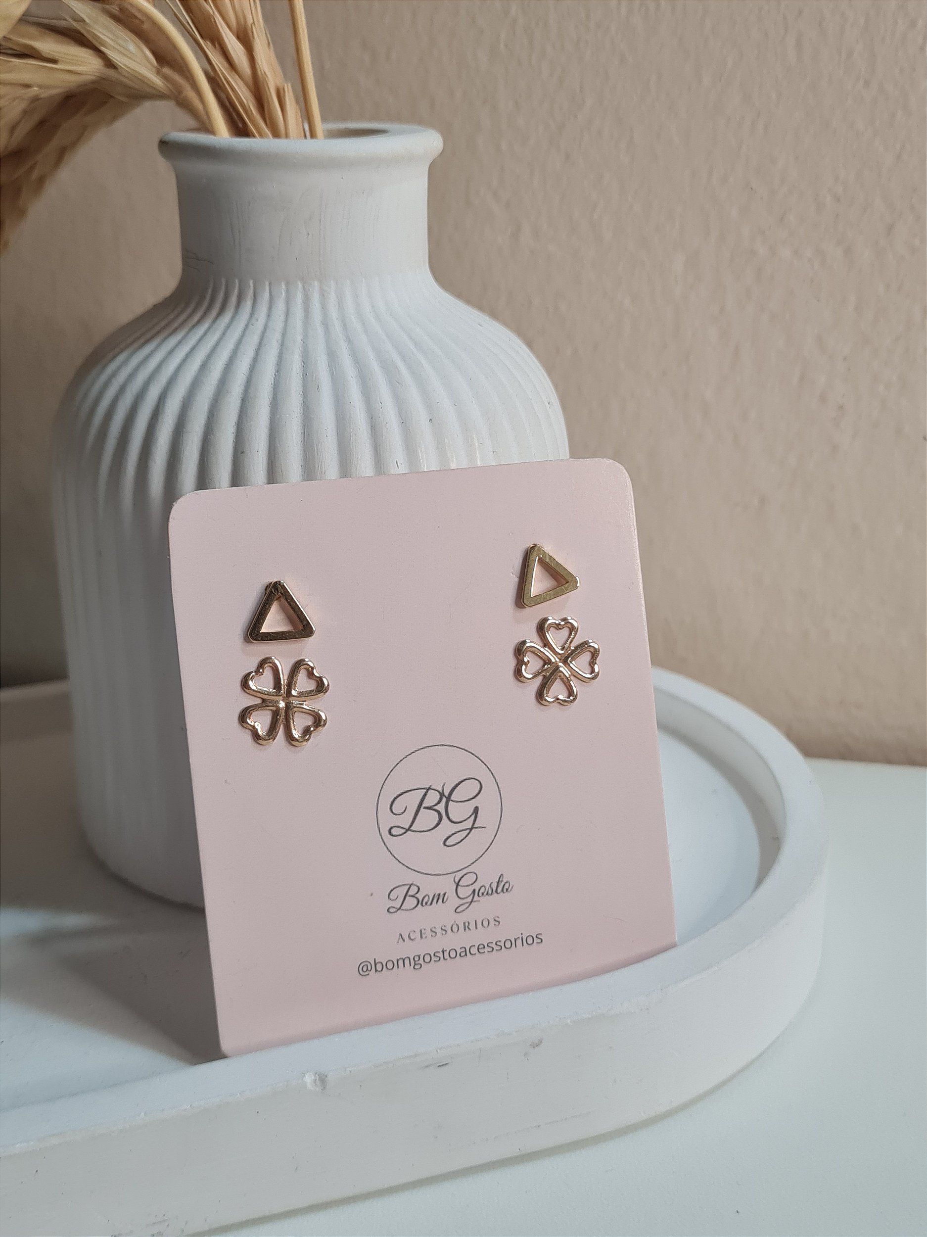 Cartela com brinco de triângulo e de trevo dourados