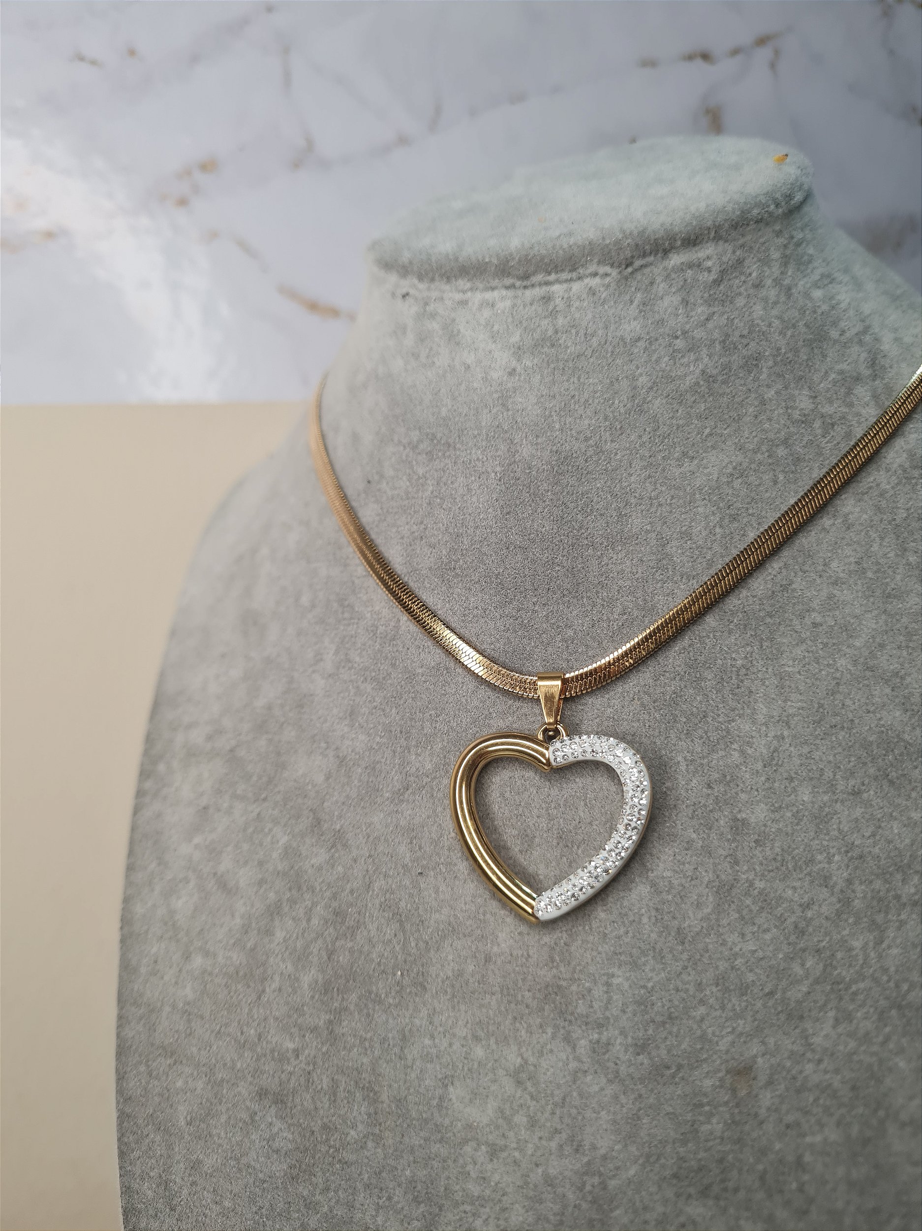 Colar de fita com pingente de coração, banhados com aço inox dourado
