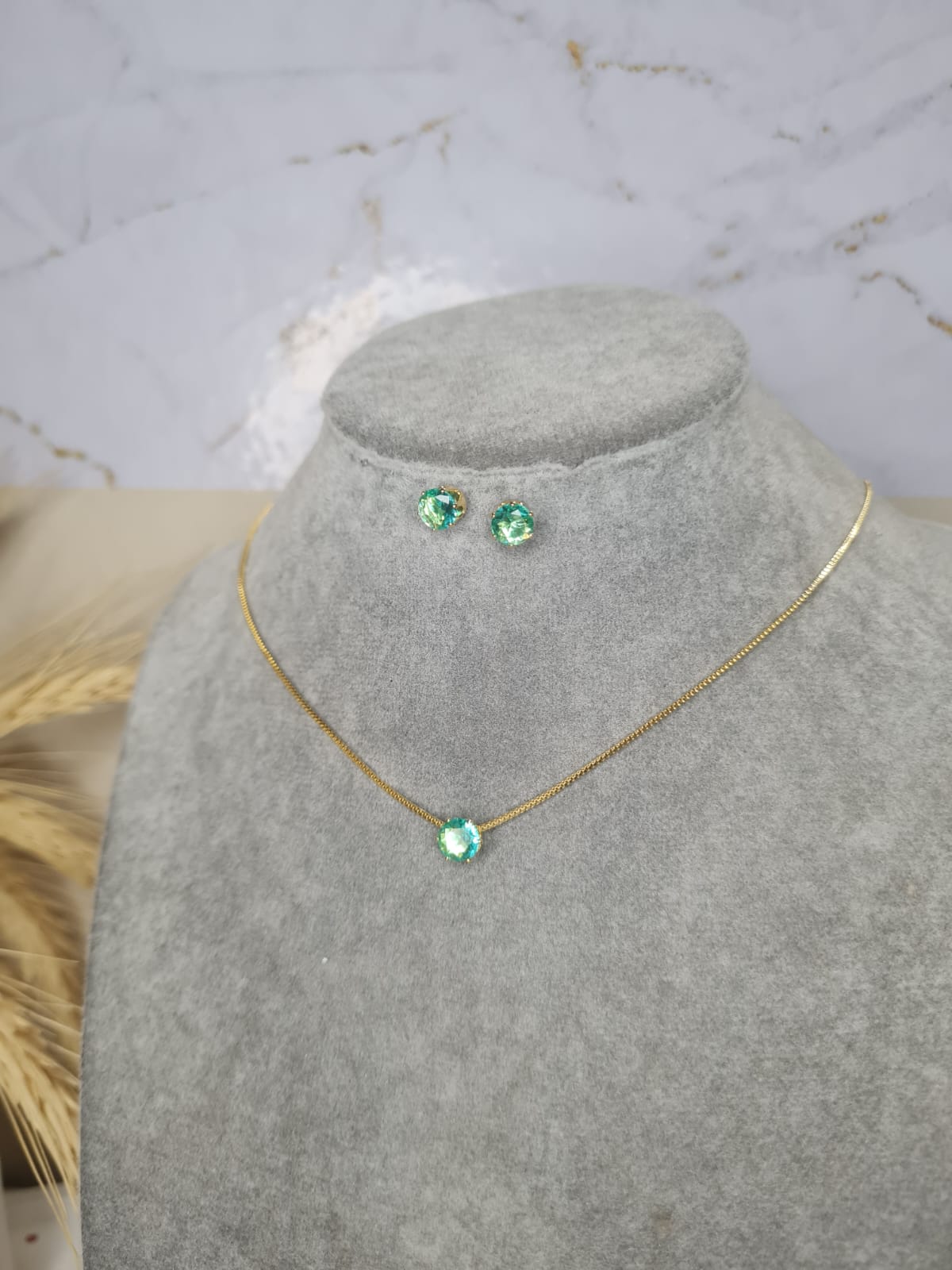 Conjunto com colar e brincos de pedrinhas de zircônia verde esmeralda, banhados a ouro.