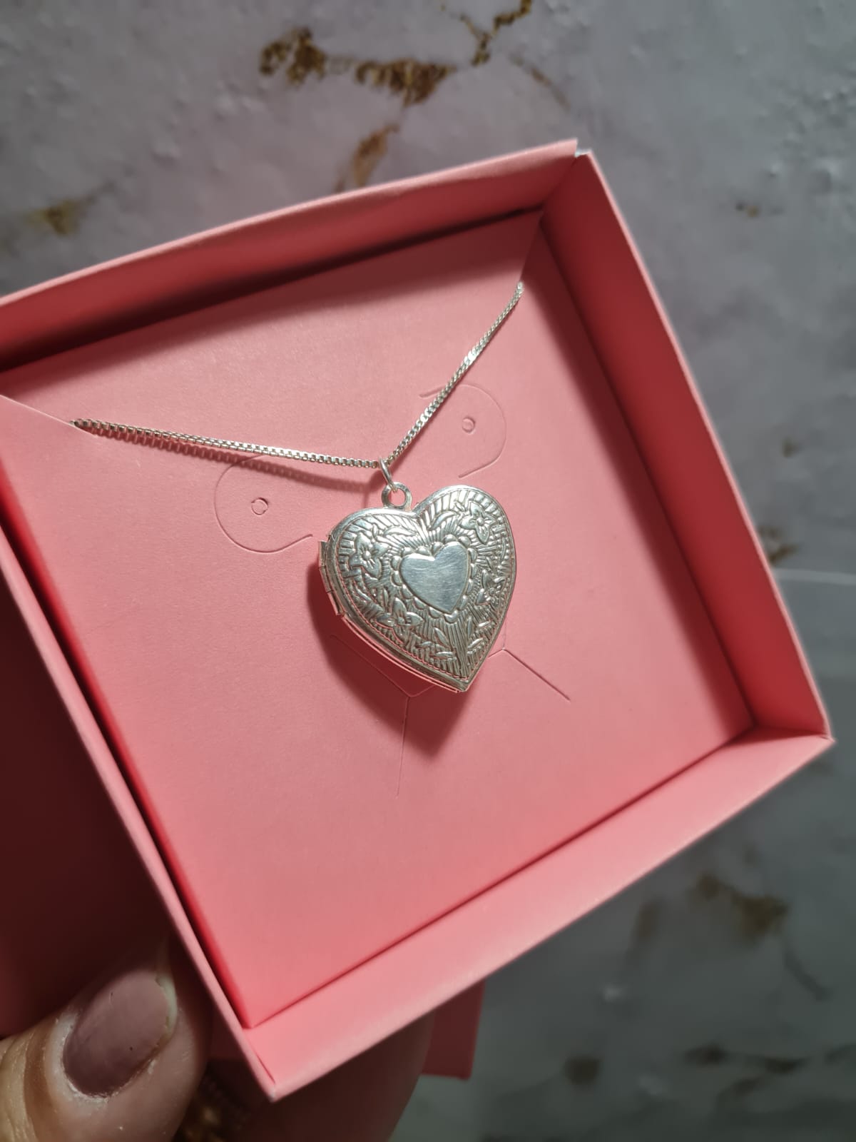 Lindo colar relicário com pingente de coração Colar médio com extensor, banhado a prata. Acompanha 2 fotos e caixinha para presente.